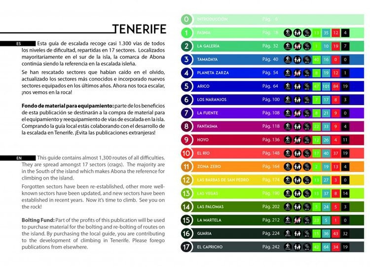 In deze gids vinden we bijna 1.300 routes van alle moeilijkheidsgraden, verdeeld over 17 sectoren. De Abona-regio, die voornamelijk in het zuiden van het eiland ligt, blijft de referentie voor eilandklimmen. Sectoren die in de vergetelheid waren geraakt, zijn opnieuw geprepareerd, waarbij de bekendste sectoren zijn bijgewerkt en nieuwe sectoren zijn toegevoegd die de afgelopen jaren zijn uitgerust.