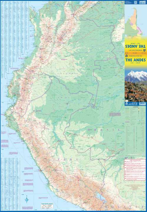 De Andes is een prachtige reeks hoge bergen die Colombia binnenkomt en zich zuidwaarts uitbreidt via Ecuador en Peru tot aan het zuiden van Patagonië. De kaart is dubbelzijdig, met de noordelijke Andes aan de ene kant en de andere kant verdeeld in twee naast elkaar liggende kaarten met de centrale Andes en de zuidelijke Andes.