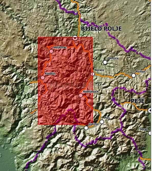 Gedetailleerde wandelkaart van het gebied Nationalpark Biogradska Gora en van het Komovi-Gebergte in de Bjelasica regio. De wandelroutes zijn duidelijk ingetekend.