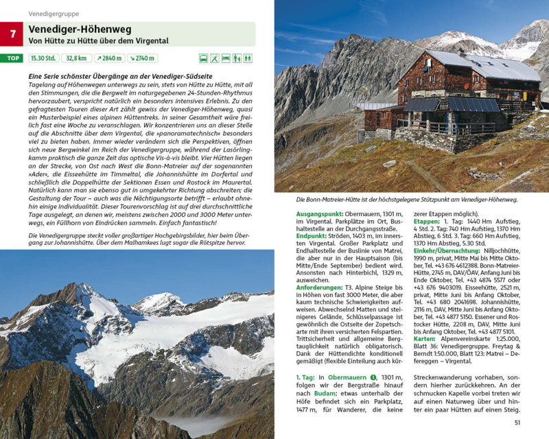 Die ausführlichen Wegbeschreibungen, detaillierte Kartenausschnitte mit eingezeichnetem Routenverlauf sowie aussagekräftige Höhenprofile mit eingetragenen Etappenpunkten und Einkehrmöglichkeiten ermöglichen eine effektive Planung und Durchführung der Touren. Eine Vielzahl von anschaulichen Farbfotos macht Lust, sofort den Rucksack zu packen und loszuziehen und Osttirols herrliche Bergwelt selbst zu erkunden.