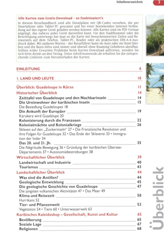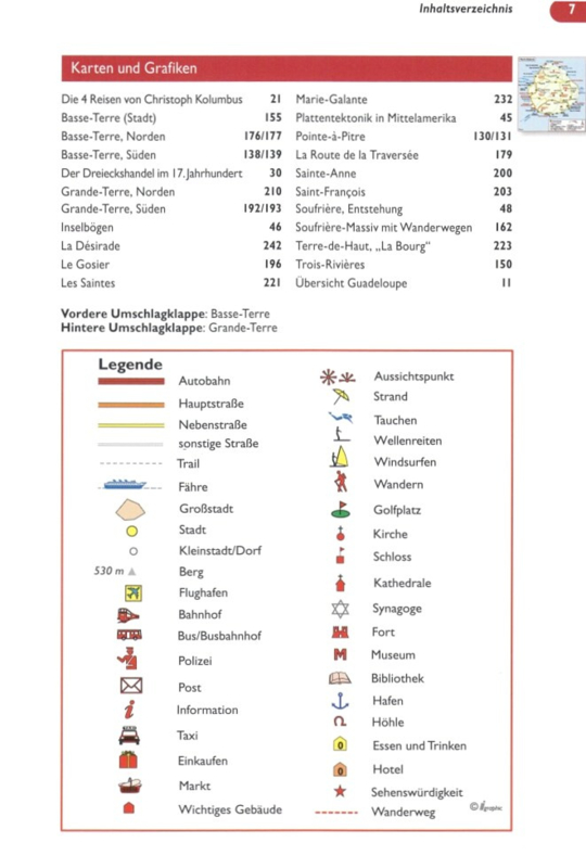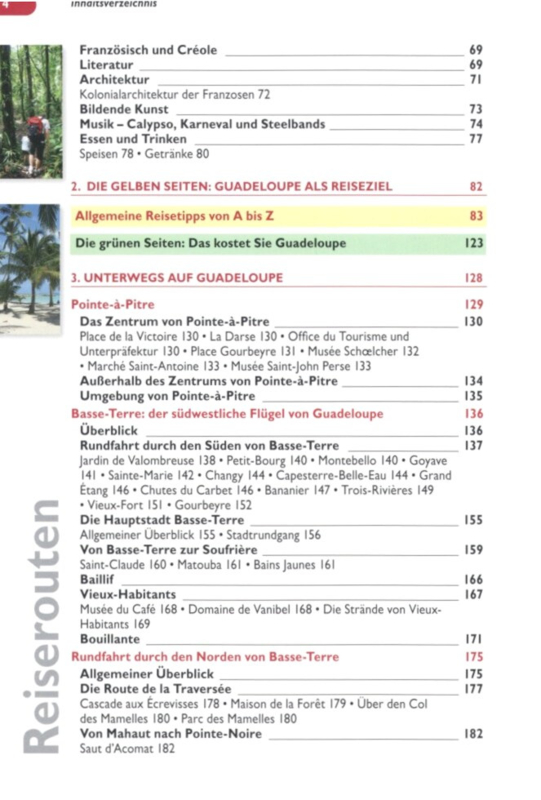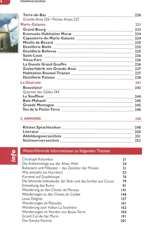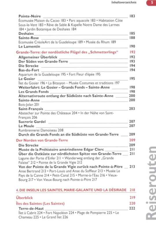 Im einzigen deutschprachigen Reiseführer zu dem Archipel werden neben den beiden Hauptinseln Basse-Terre und Grande-Terre auch die kleineren Inseln Marie-Galante und La Désirade sowie die Îles des Saintes und die Îles de la Petite-Terre vorgestellt.